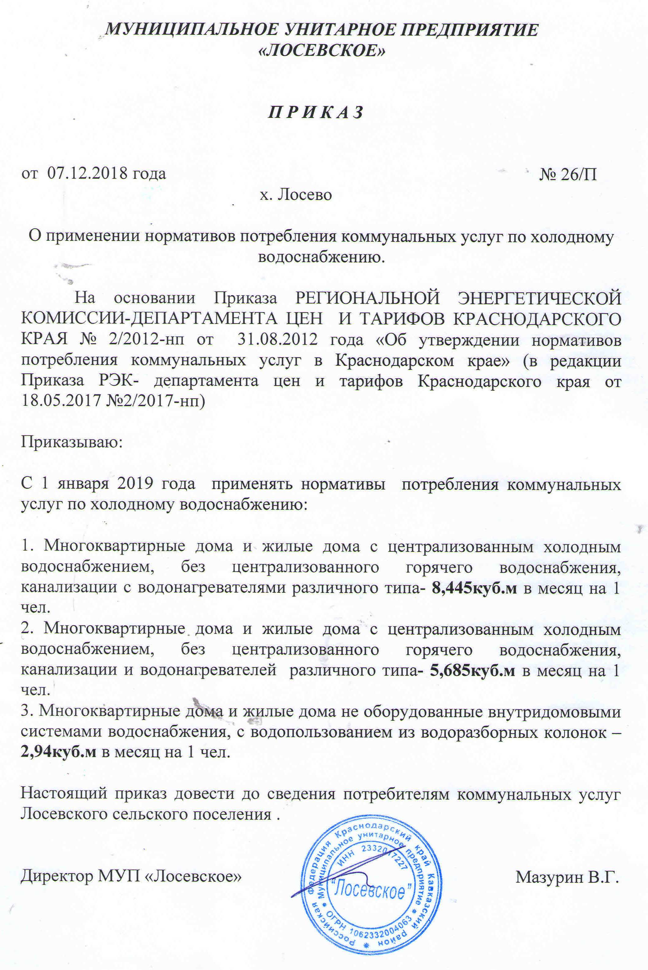 Приказ №26/п от 07.12.2018 года